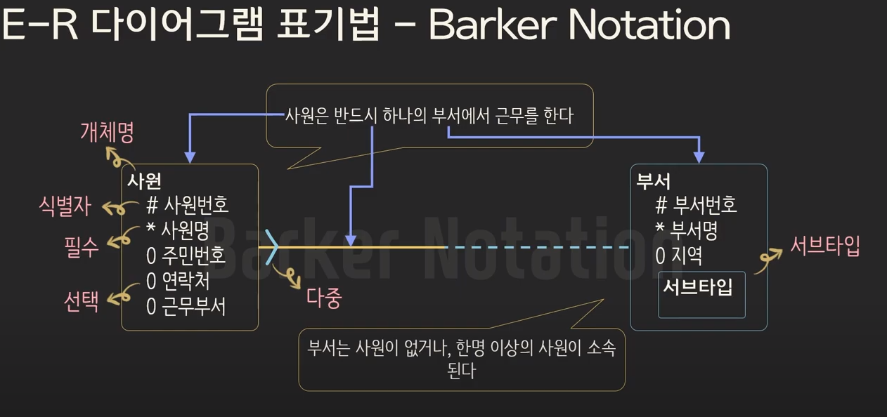 *** 바커 표기법은 관계(1:1 등 개체 간 관계에 대한 대응 수)를 링크 위에서 실선/점선으로 구분한다. 위 그림에서 사원개체와 부서 개체의 관계는 1:다 관계라고 할 수 있다.
