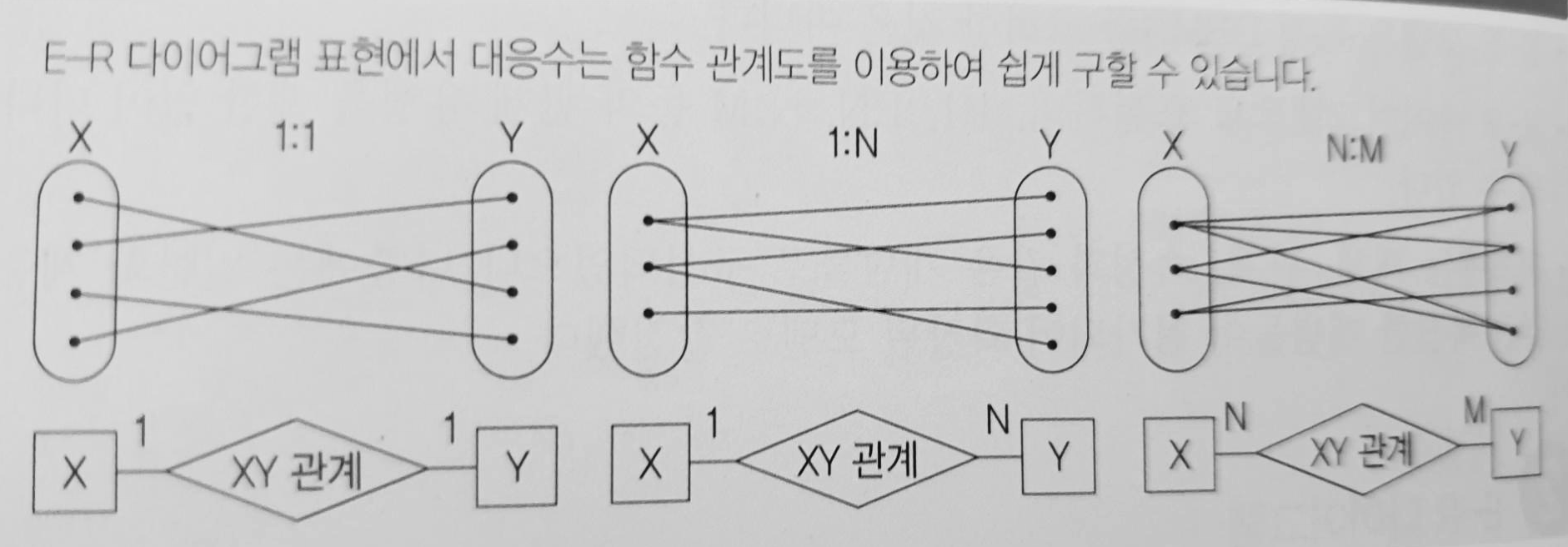 관계 1:1, 1:N, N:M 등의 개체 간 관계에 대한 대응수를 선 위에 기술한다