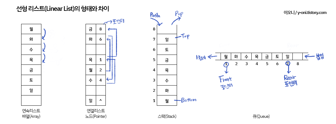 위 그림 에서 "연결리스트, 노드(Pointer)" 부분을 보면, 요일은 순차적이지 않은 형태로 리스트에 배치되어있다.